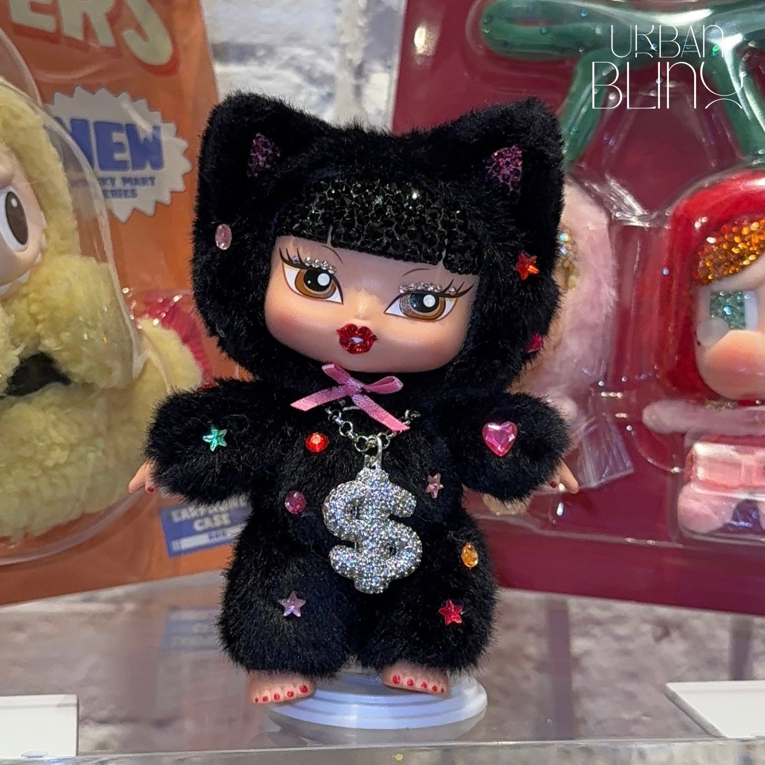 Custom hand rhinestoned by UB in hand placed Swarovski rhinestones and plastic gems. Necklace is custom made, No two Kool Kat Bratzies will have the same gem placements on the body